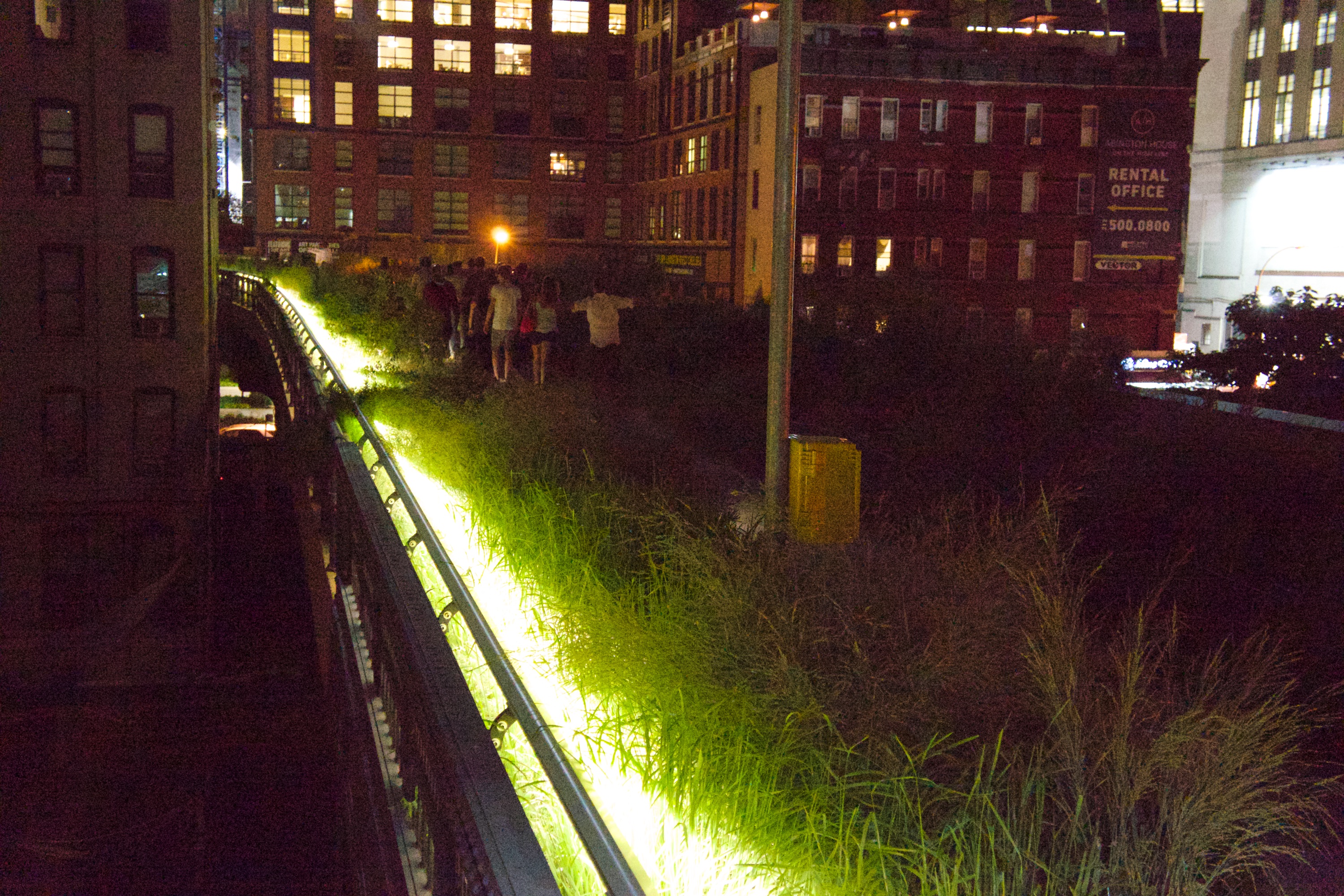 The High Line began life in 1934 as an industrial railway line – built on high stilts, and weaving between the sky scrapers of lower west Manhattan. By the 1980’s trucking had made the railway redundant and it wasted away. There were attempts to demolish it, but these were resisted by local residents. In 2002 a design competition was launched to find new uses for the High Line – and by 2006, the railway is handed over to the City and work began on its restoration and redesign. Just a few weeks ago, the third section has opened, and New Yorkers and visitors to the city can now walk for 2 miles day and night. The redesign was based on the natural process that overtook the line after the trains stopped – wild flowers and grasses are planted along its length. Both my visits to date have been at night time when the flora is lit up creating a wonderful atmosphere.